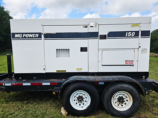 FOR SALE:  This MQ Power WhisperWatt 150 (120 KW) trailer mounted generator model DCA-150SSVU is equipped and ready for your need. It features a Volvo / TAD720GE engine, EPA Tier 2 Certified, Electric Start, 4-cycle water cooled direct injection, turbocharged with air to air Intercooler.